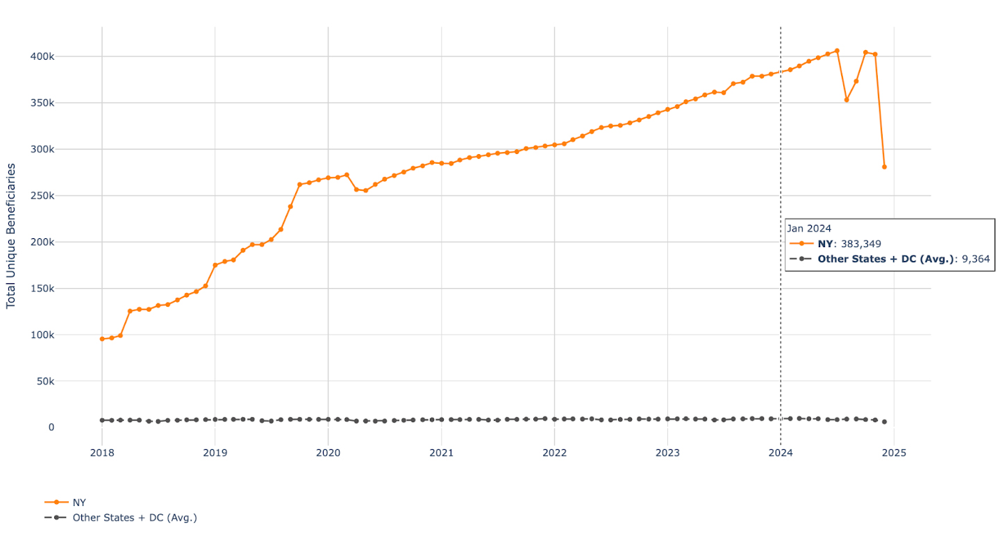 This gap is not explained by Medicaid enrollment. In January 2024, New York had approximately 7.1M Medicaid and CHIP enrollees, compared to 1.7M in Massachusetts — about a 4x difference in enrollees. If T1019 spending scaled proportionally with enrollment, we would expect New York’s T1019 payments to be roughly 4x that of Massachusetts. Instead, New York’s T1019 payments were 8.8x higher, nearly double what would be expected based on enrollment.