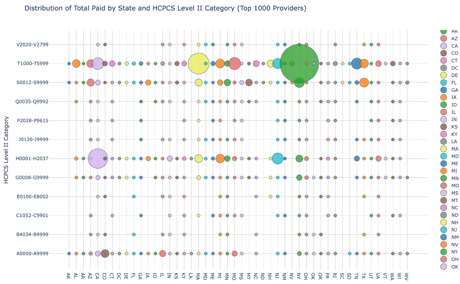 While New York’s share of T1019 payments compared to Massachusetts is compelling on its own, the trend becomes even more apparent when compared to the other states. The chart below maps total Medicaid spend by state against HCPCS code categories (Level II only), with each dot representing a state-code combination. In the T1000-T5999 row, which contains T1019, New York’s concentration in this data set generates a bubble so large it is not meaningfully comparable to any other. New York's personal care spending does not sit at the far end of a distribution — it occupies a separate category.
