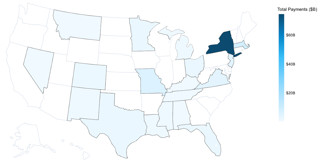 In the HHS data set, T1019 represents $123 billion in national spend over the dataset period, and New York alone accounted for 61% of that spend, or $75 billion. The second-highest paid state, Massachusetts, accounts for $8.4 billion.