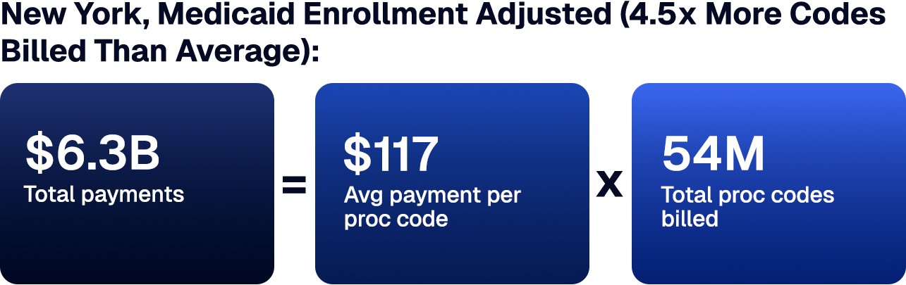 As a simple proxy, New York Medicaid and CHIP enrollment was 7.1M in January 2024, and the average enrollment across all other states was 1.6M (aggregate enrollee count across other states was 76.8M5). There are roughly 4.5x more Medicaid enrollees in NY than the average state, yet New York billed for 41x as many beneficiaries of personal care services during the same period (January 2024). Something is not adding up.